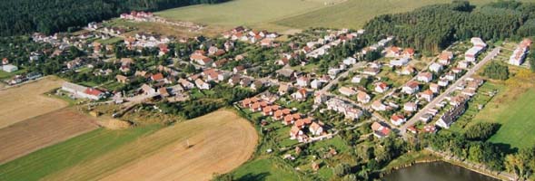 1. Pohled od severozápadu (za parkovištěm a stromy v pozadí vede silnice do Roudničky).
